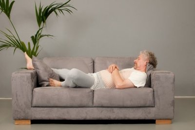 Pidä sama asento sohvalla, mutta tartu kädellä nilkasta kiinni. Pidä lantio riittävän alhaalla, niin jalkaa ei tarvitse vetää voimakkaasti takamusta kohti. Jännityksen saat aikaan yrittämällä suoristaa jalan käden estäessä suoristamista. Käänny ja venytä toisen jalan etureidet.