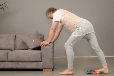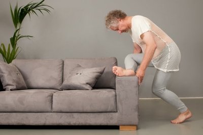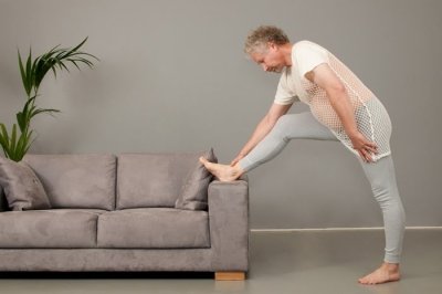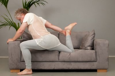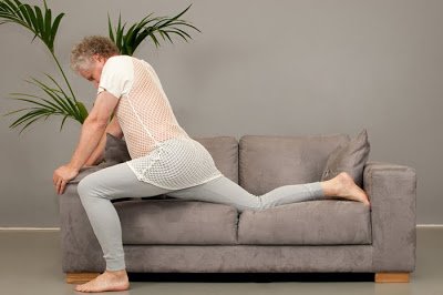 Laske toinen jalka kuvan mukaisesti lattialle ja pidä toinen jalka suorana sohvalla. Anna lantion painua vähitellen alemmaksi. Jännityksen saat aikaiseksi painamalla suorana olevaa jalkaa sohvaa vasten. Tämä venytys saa kestää parikin minuuttia. Käänny ja venytä toinen lonkankoukistajalihaksisto.